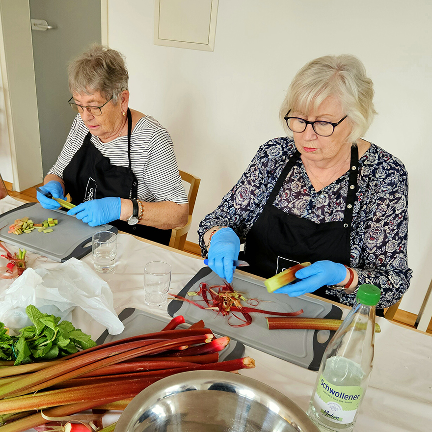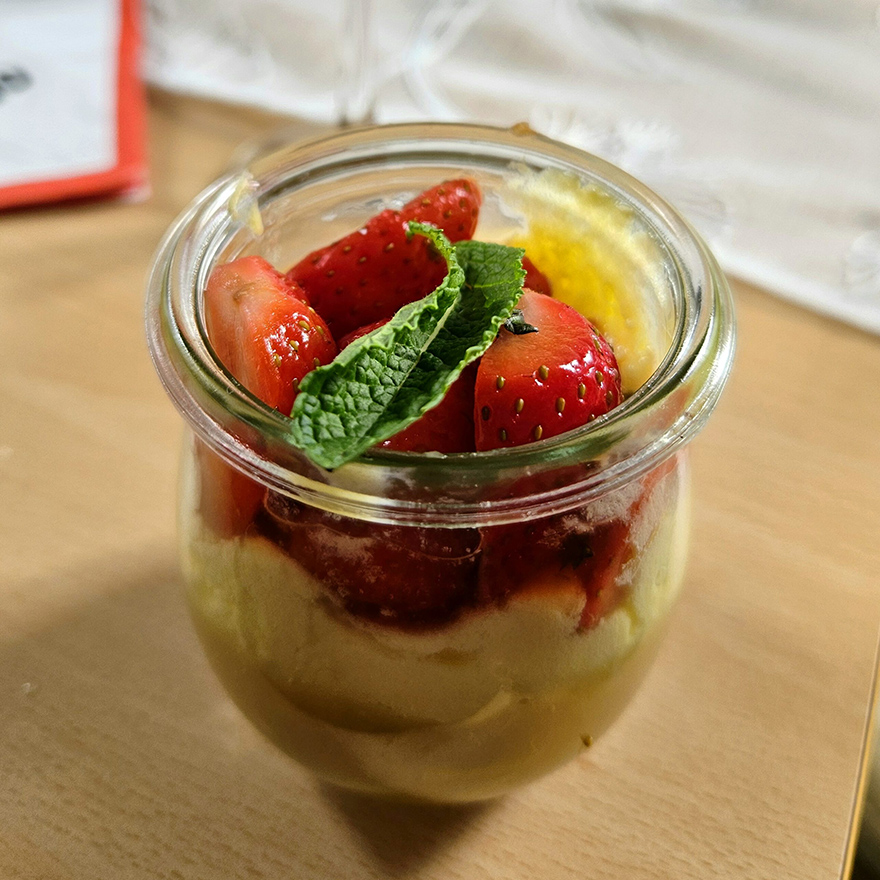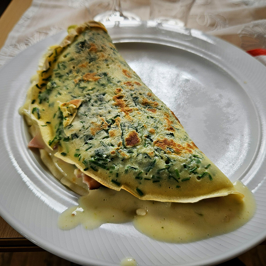 Zur Vorspeise gab es einen vitaminreichen Frühlingssalat mit gebackenen Fetakrüstchen. Der Hauptgang bestand aus luftigen Kräuterpfannkuchen, gefüllt mit Spargel und Schinken. Zum krönenden Abschluss wurden marinierte Erdbeeren und Rhabarber mit Vanilleschaum serviert.